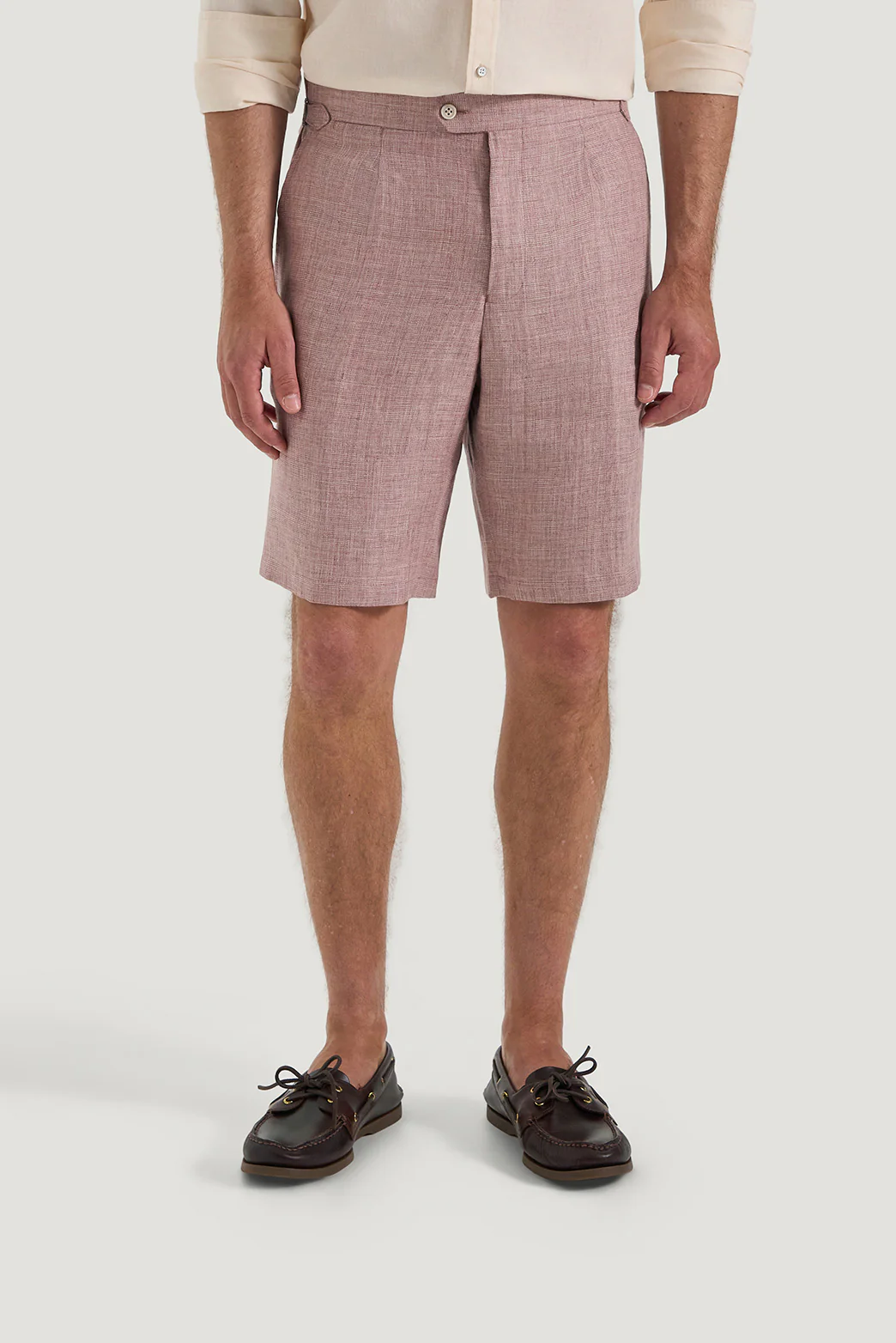 Crafted from 100% European Flax® linen, the Salinger Short is woven in a soft melange yarn and lightly washed for a naturally relaxed feel. Cut in a Regular Fit with a single pleat and refined tailoring elements, it features a flat front, side adjusters, and tailored waistband for a clean, adaptable fit. Double back welt pockets and AMF-stitched detailing reinforce its craftsmanship, while the hemmed finish and breathable linen make it a warm-weather essential. The cloth’s tonal melange adds understated dimension, embodying comfort without compromise.